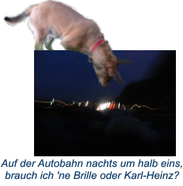 Ich glaubte schon, dieses Mal müßten wir zu keinem Autotreff. Als dann recht bald doch einer zusammenkam, atmete nicht nur ich erleichtert auf, als er recht schnell war. Jule interessierte das weniger, sie schlief fast die ganze Fahrt. Nur als sie eine dicke Taube auf der Leitplanke sitzen sah, ließ sie ein erzürntes Gekeife hören, um sich anschließend gleich wieder hinzulegen. Die Fahrt ging anschließend zügig voran, unterbrochen nur von kleinen Pausen, bis wir dann zu einem riesigen Treffpunkt kamen. Hund, Hund, ich glaubte schon, ich würde nie mehr nach Hause kommen. Mich drückte inzwischen zudem das Gedärm, und ich wurde doch sehr unruhig. Es ist nicht so einfach, die Popopacken zusammenzukneifen, wenn man gleichzeitig doch etwas aufgeregt ist. Zum Glück fuhren wir bei der nächsten Gelegenheit von der Autobahn ab und hielten in der Wildnis an. Ich stürzte aus dem Wagen hinaus und tat schnellstmöglich das, was ein Hund tun muß, wenn es ihn so pressiert. Die Weiterfahrt verlief dann problemlos, auch als wir wieder auf eine Autobahn auffuhren.